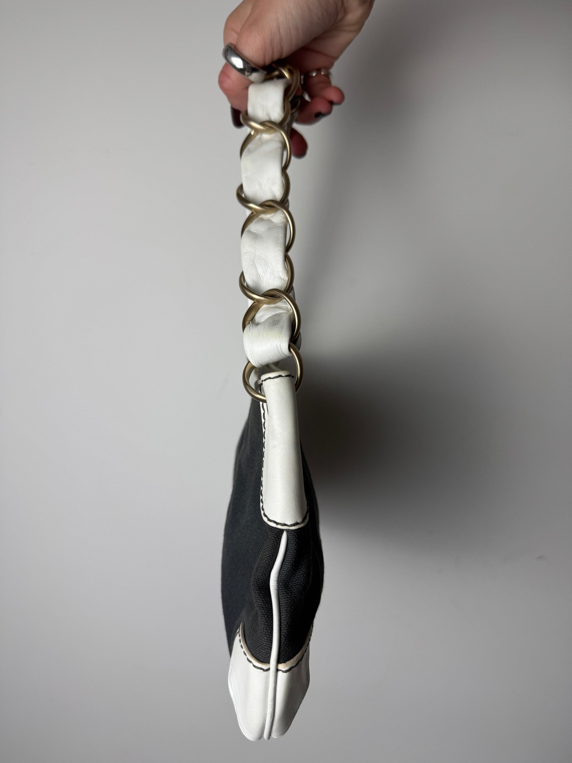 A beautifully aged 1990s Chanel shoulder bag in canvas with stitched tonal CC logo, contrasted by off-white leather panels and a chunky leather-woven chain strap.