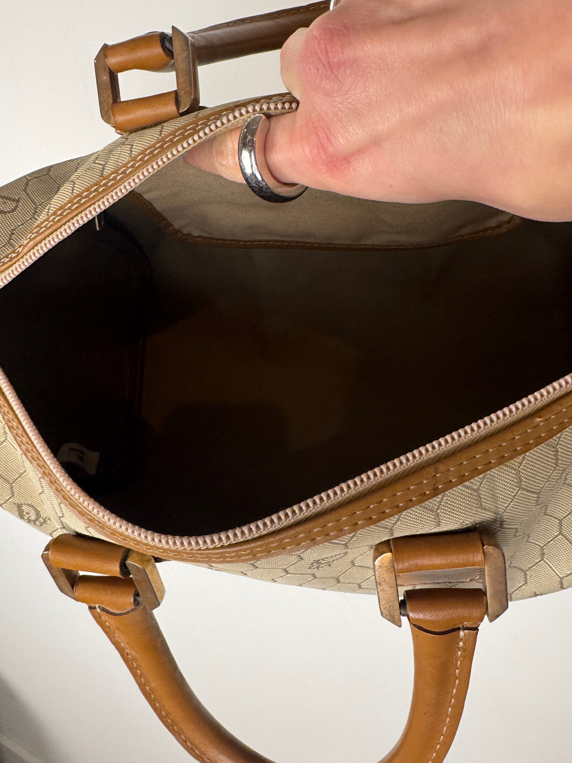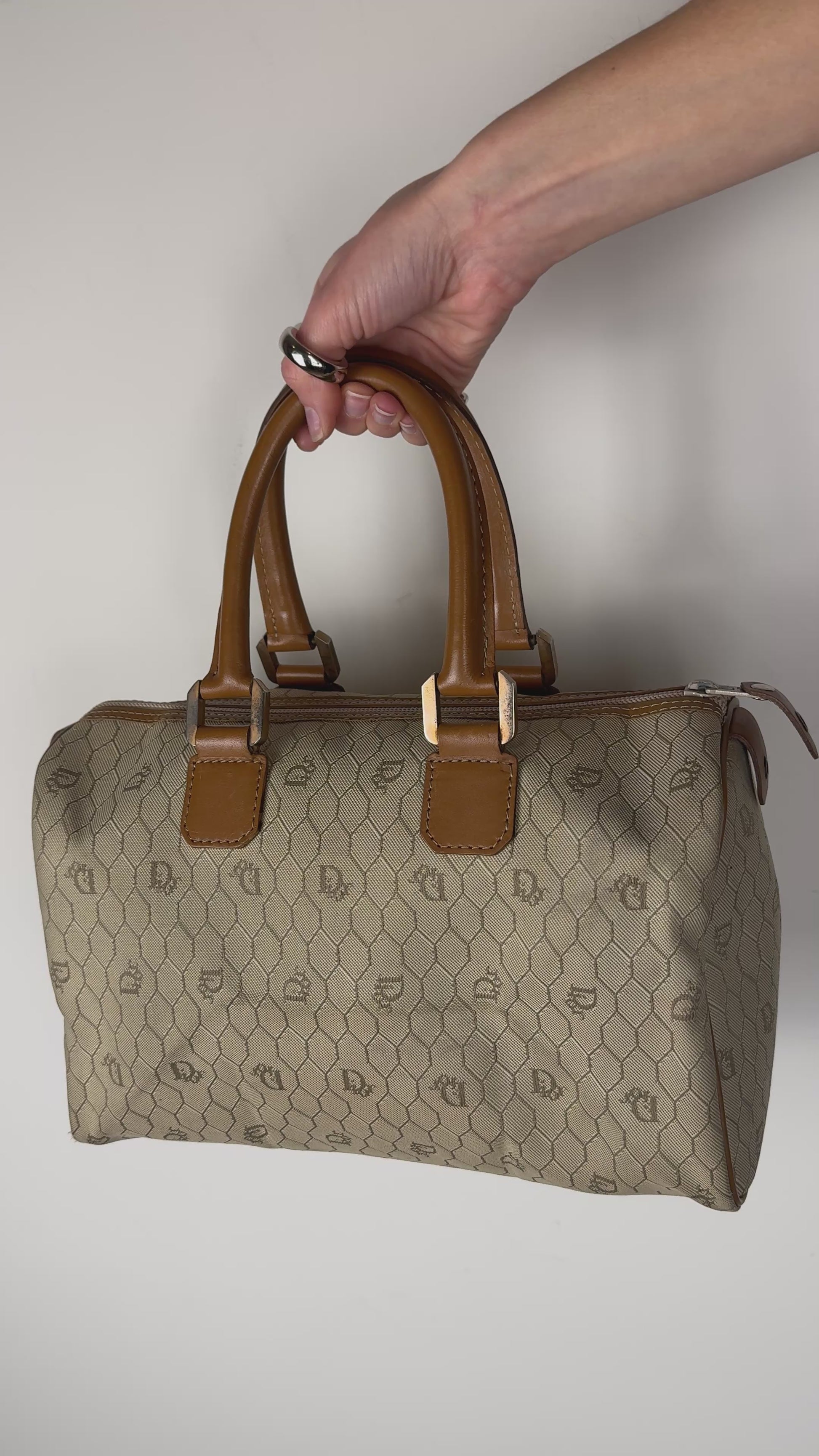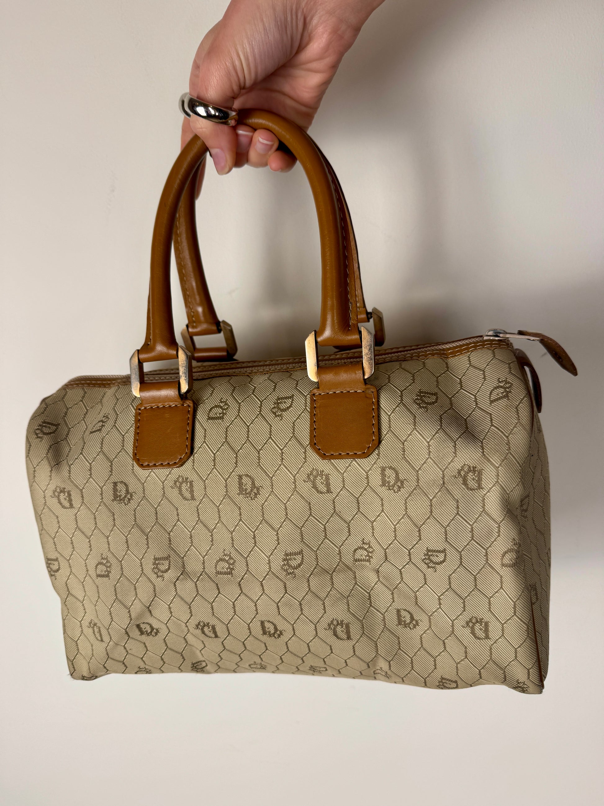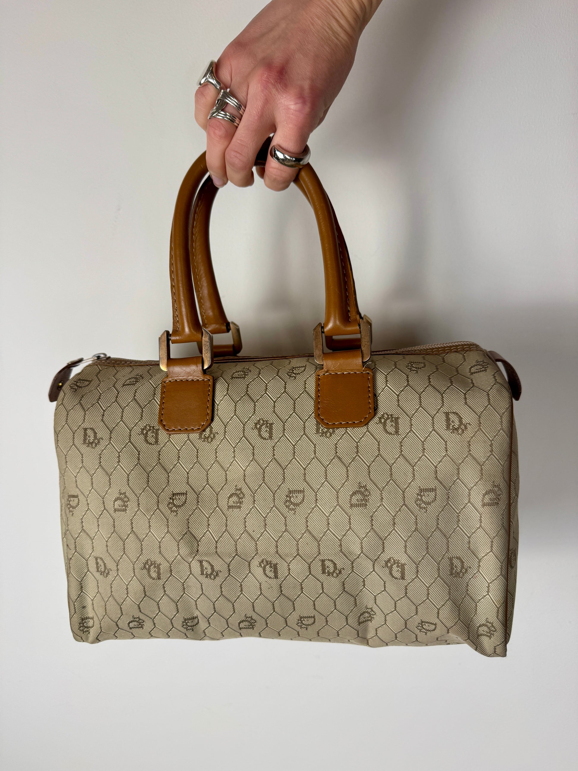 A classic vintage Dior Boston bag crafted in the iconic beige honeycomb canvas, finished with warm brown leather trim and structured top handles. The honeycomb motif is one of Dior’s most recognisable archival patterns, subtle yet unmistakably branded, and especially loved for its graphic, almost architectural feel. The structured Boston silhouette gives this piece a timeless elegance while still feeling practical and wearable for everyday use.