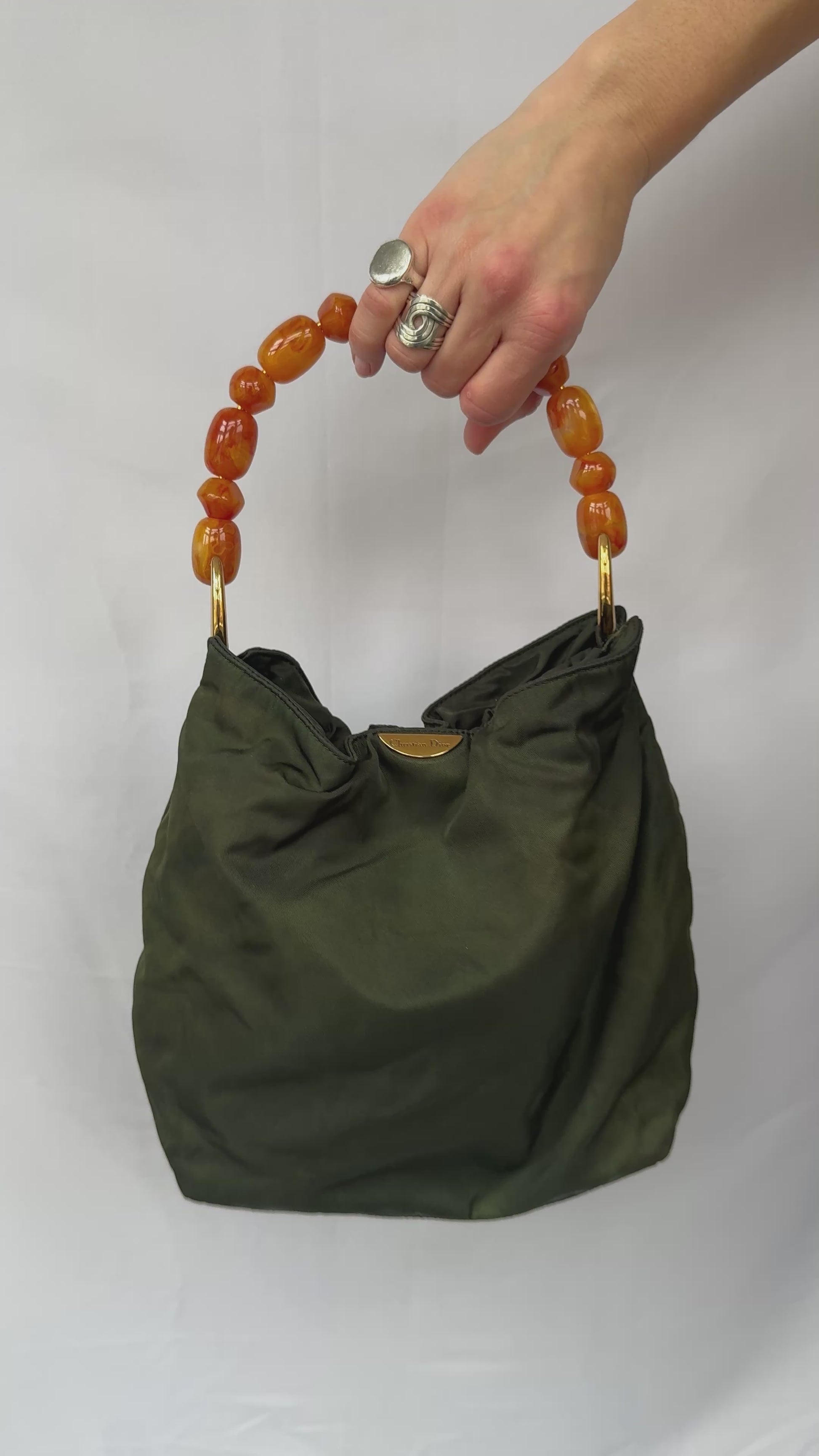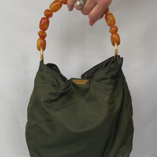 A collector-level Dior piece from the John Galliano era (1996–2011), crafted in deep-olive nylon with a amber-resin beaded handle and gold-tone hardware. The soft, gathered shape contrasts beautifully with the bold handle. The interior features Dior’s signature jacquard lining, magnetic closure, and comes with the original authenticity card.