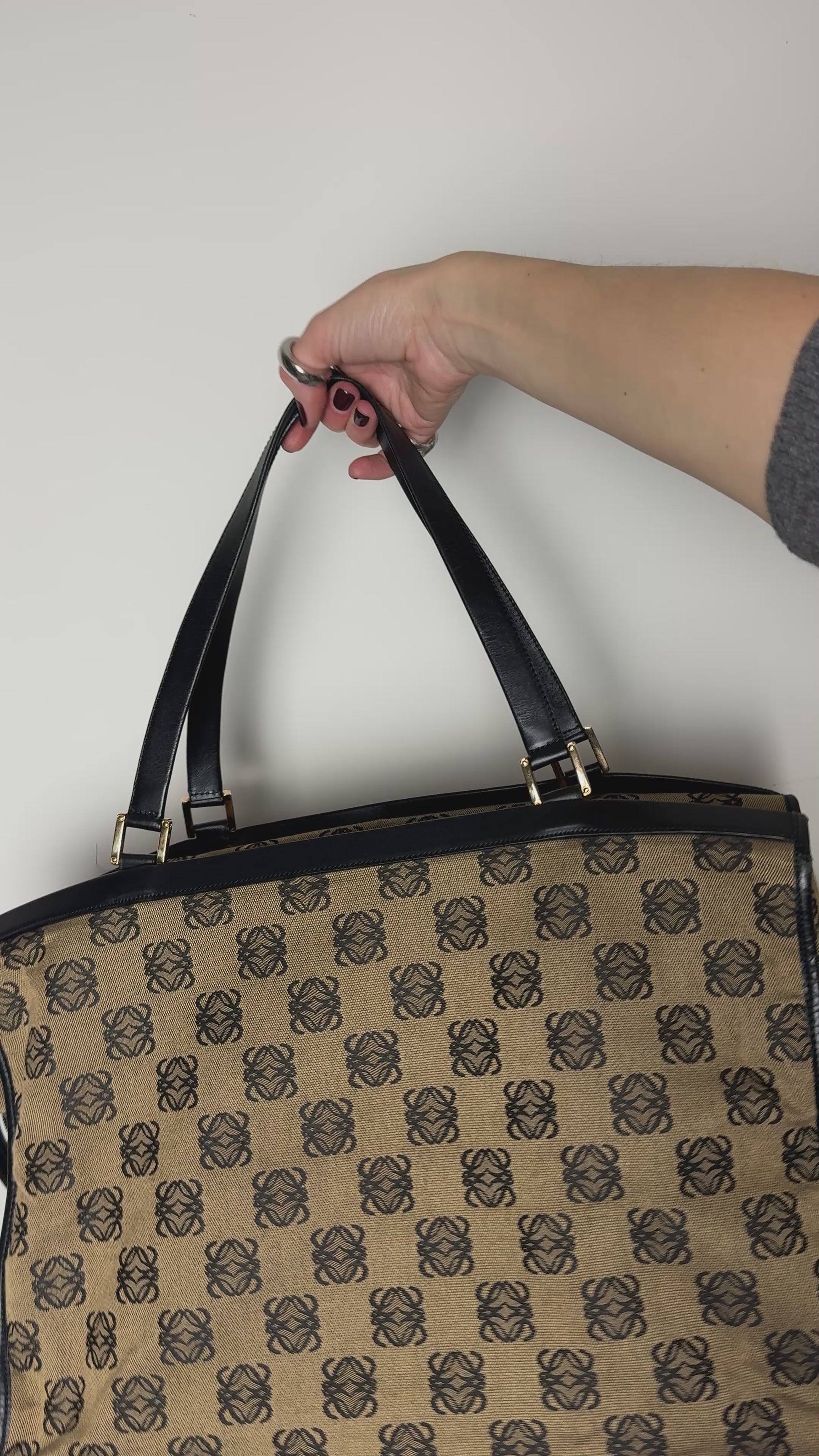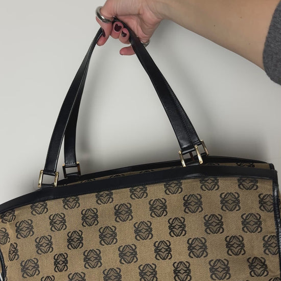 The beige canvas with the repeated Anagram motif feels very classic Loewe. Recognisable but still refined. The black leather trim sharpens the whole silhouette and gives it structure, while the gold tone hardware adds that subtle polish without tipping into flashy.