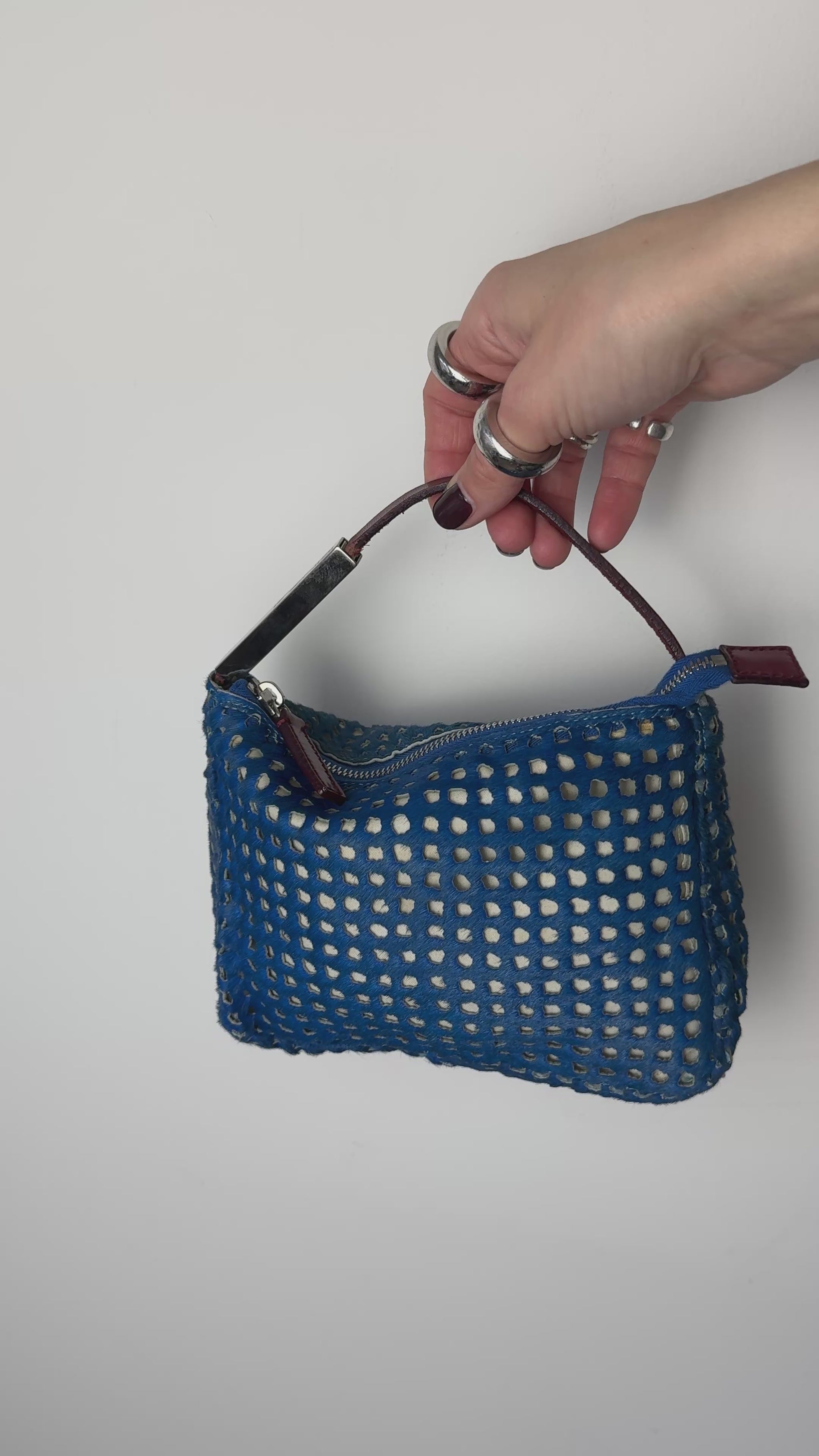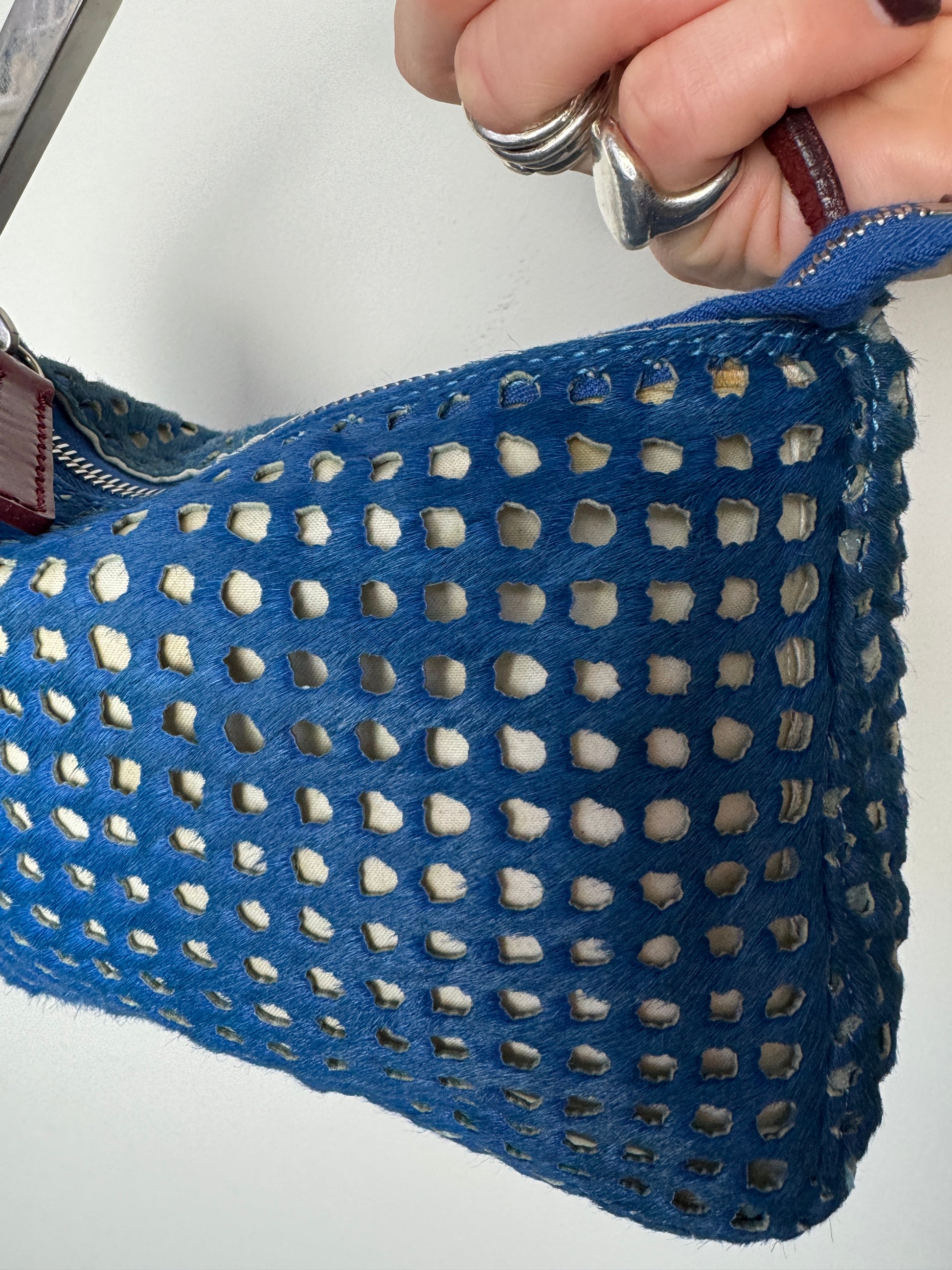 This piece is perforated pony hair leather in a vibrant cobalt blue, layered over a lighter base so the cut outs create depth and contrast. The burgundy leather handle and metal Fendi logo bar add that slightly industrial early 2000s edge.