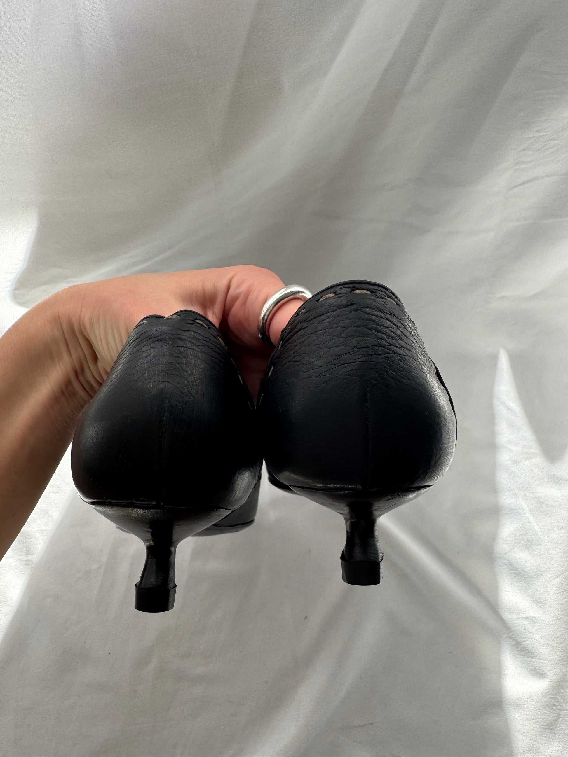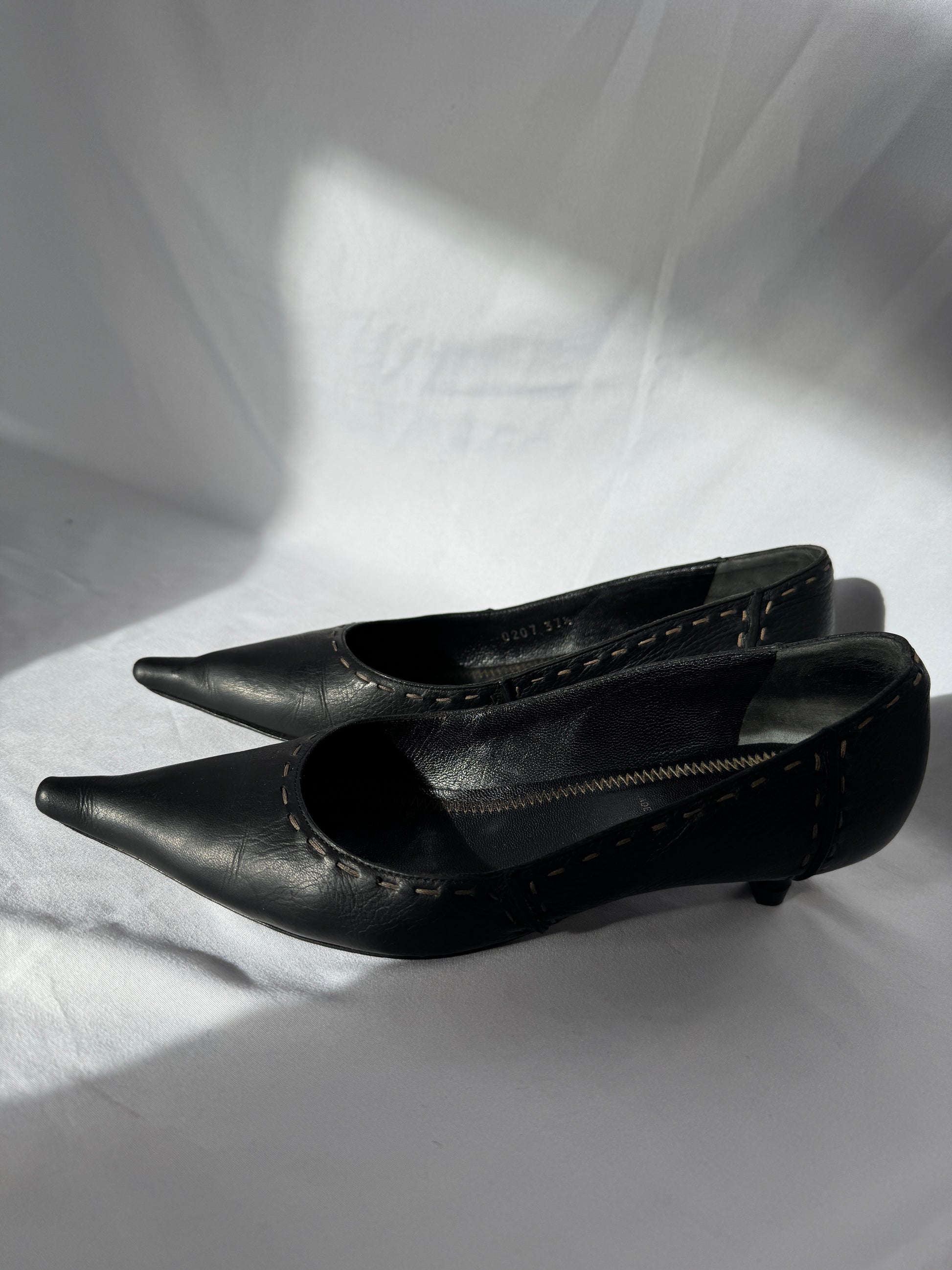 This pair is made in Italy from vero cuoio leather with a sculptural kitten heel and whipstitch trim framing the upper. A sharply pointed toe gives it that early-2000s edge — sleek and minimal.