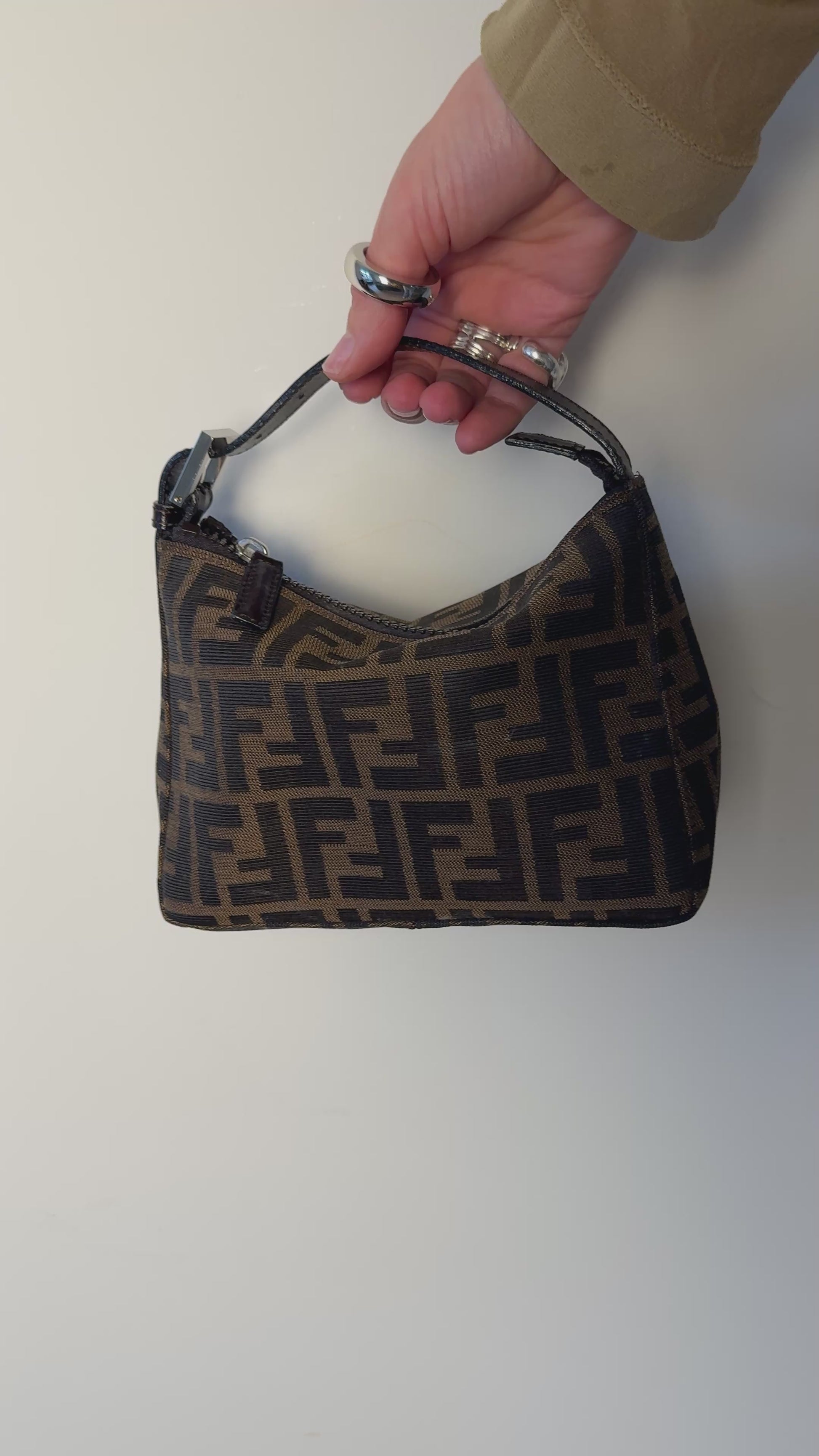Made from Fendi’s signature brown Zucca canvas with dark brown leather detailing and silver-toned hardware, this piece features a top zip closure and a short strap designed for hand or wrist carry. Its proportions and construction reflect the same era that birthed the iconic Baguette. Just scaled down to an even more minimal, collectible format.