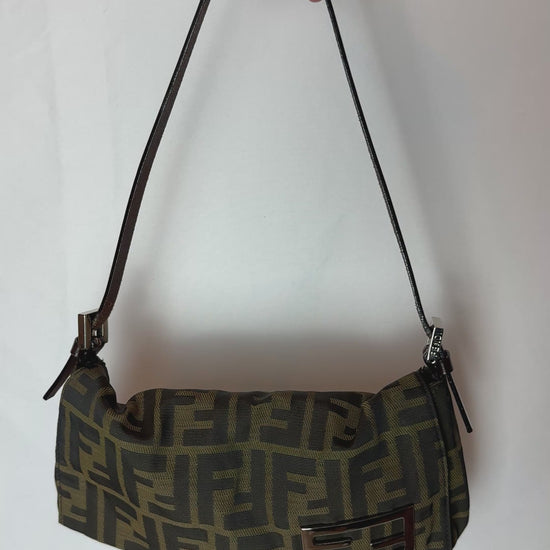 A perfectly preserved compact Fendi pochette crafted from brown Zucca canvas with a dark leather strap and silver tone logo buckle. This version features a slightly rounded silhouette and flap closure, giving it a softer and more casual feel than the structured baguette styles of the same era. It’s finished with the classic Fendi logo hardware and adjustable strap detail.