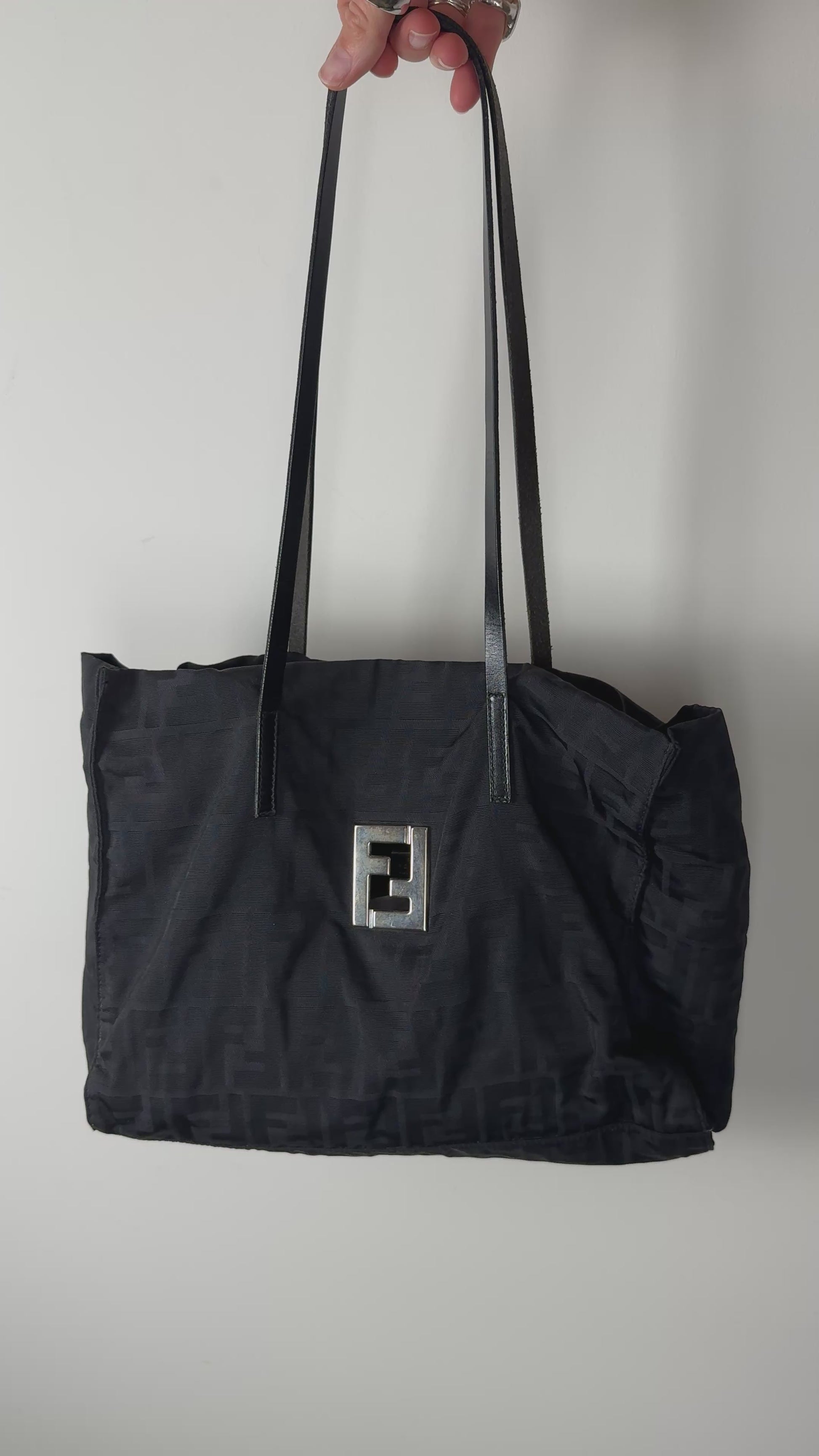 Small black tote in monogrammed Zucca nylon with slim leather shoulder straps and a silvertone FF logo clasp. A perfect representation of the late-90s Fendi aesthetic. Sleek, practical, and instantly recognizable without being loud. The tonal jacquard gives a subtle texture that catches the light, making the monogram visible only when you move.