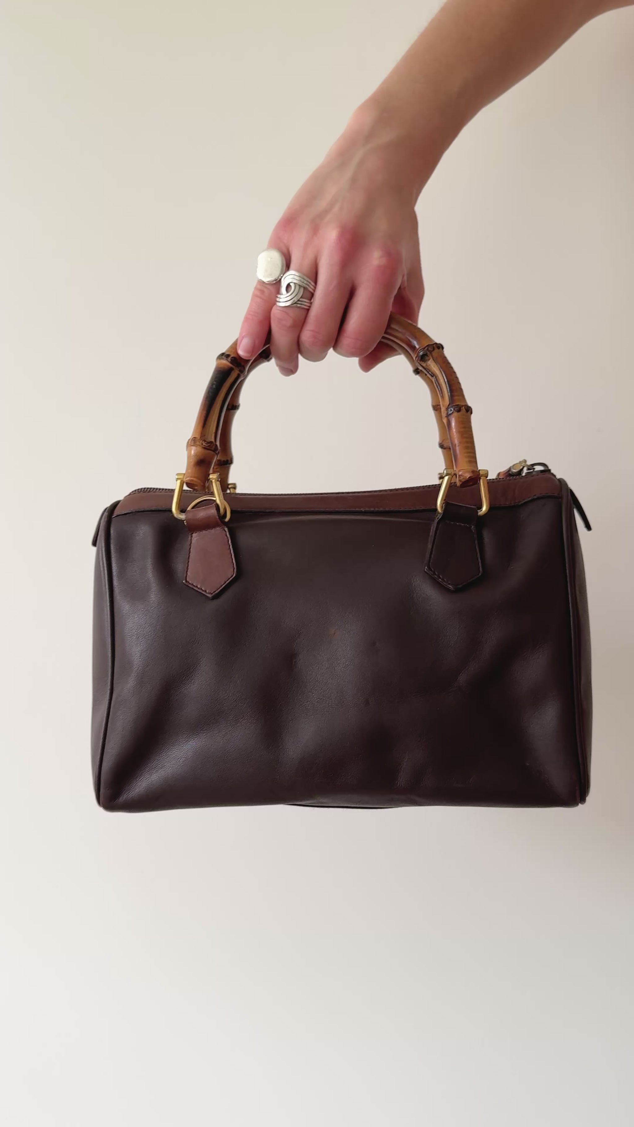 A timeless Gucci bamboo handle bag crafted in smooth chocolate brown leather with signature curved bamboo top handles and gold-tone hardware. The compact, boxy shape and subtle structure nod to Gucci’s 1947 heritage design, reimagined in the late 1990s under Tom Ford’s creative direction.