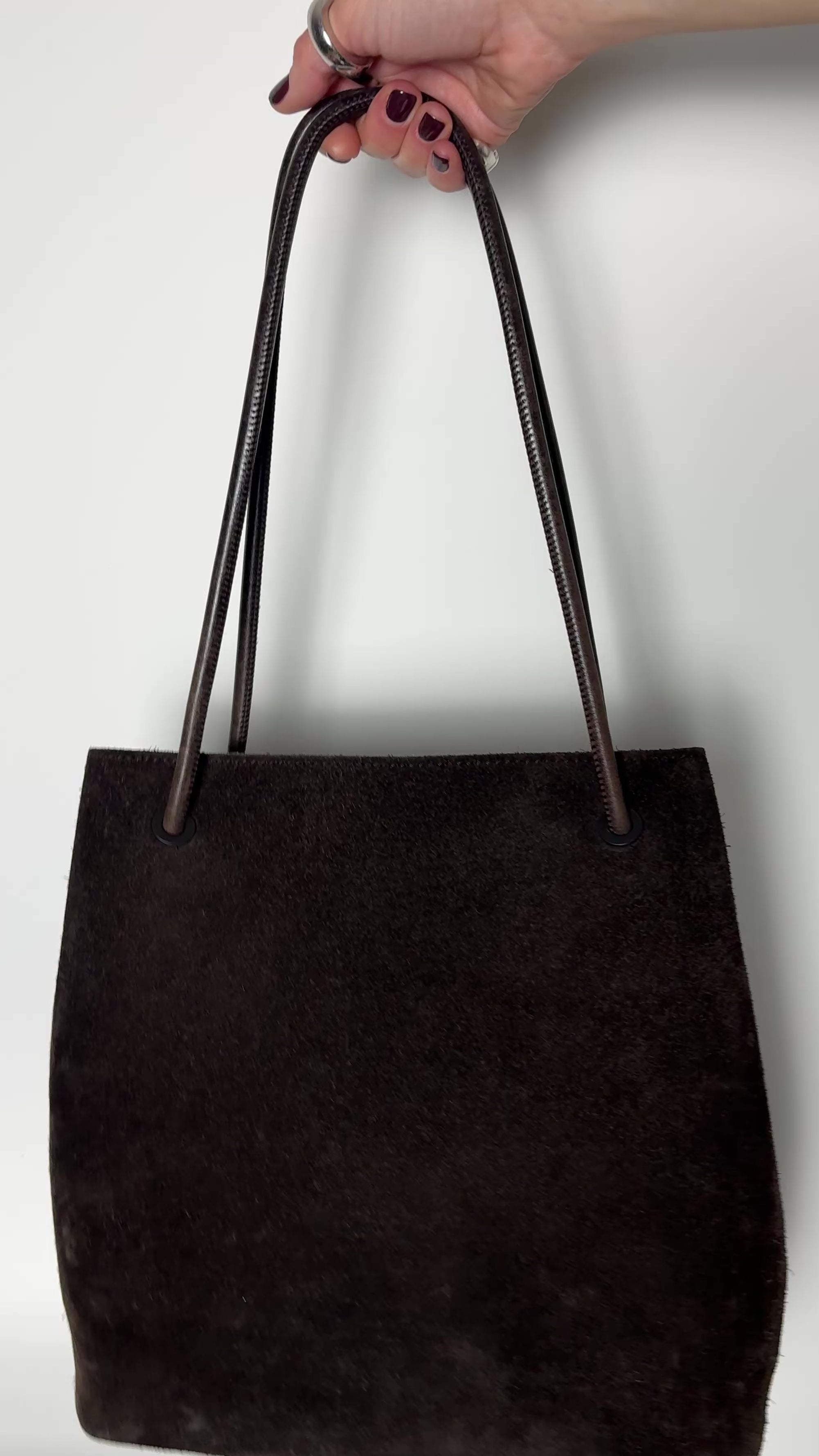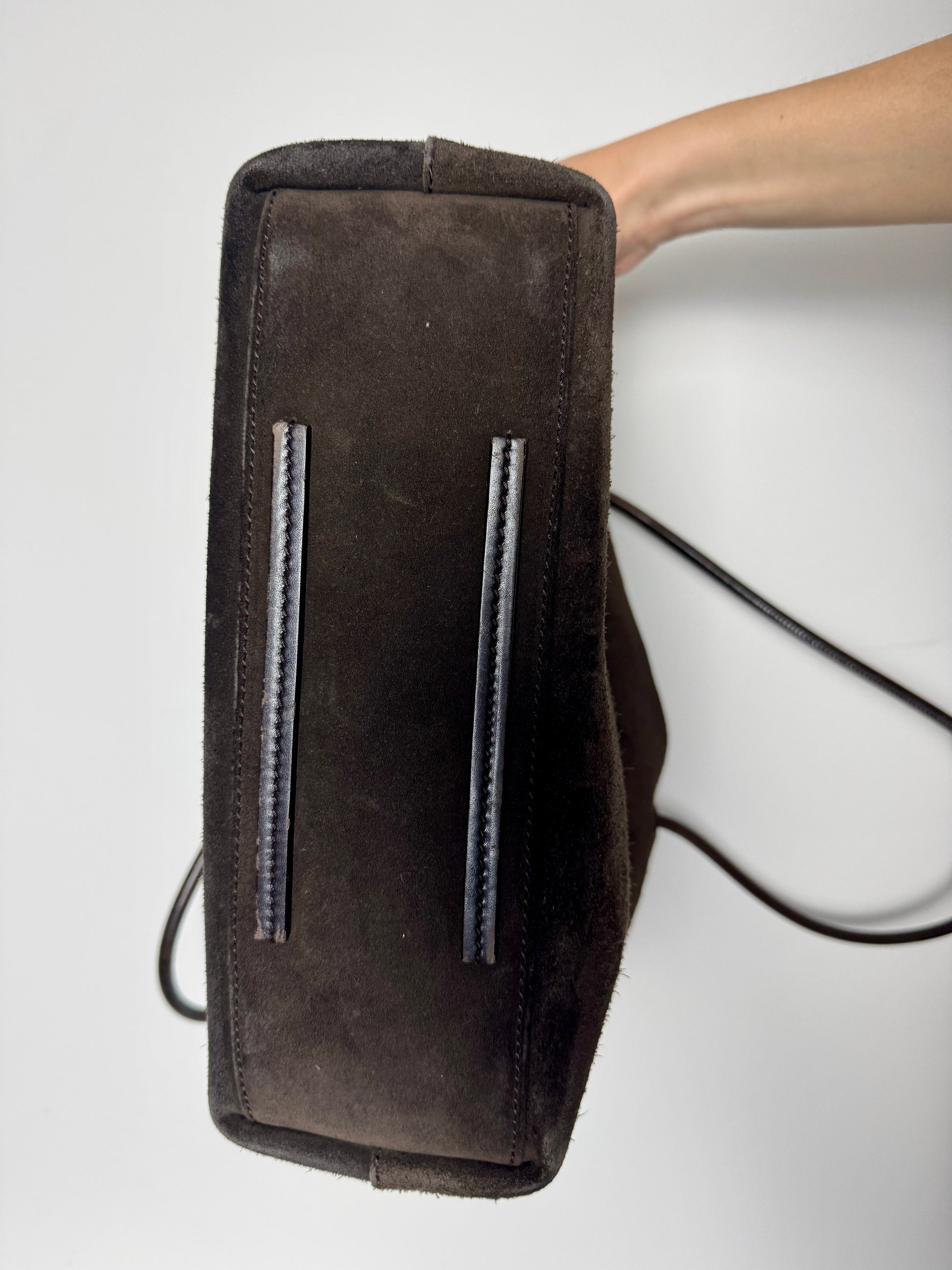 A minimal, logo-free Gucci tote crafted in dark brown suede with slim leather shoulder straps. The design is deliberately understated. No exterior branding, no oversized hardware, just material and form.