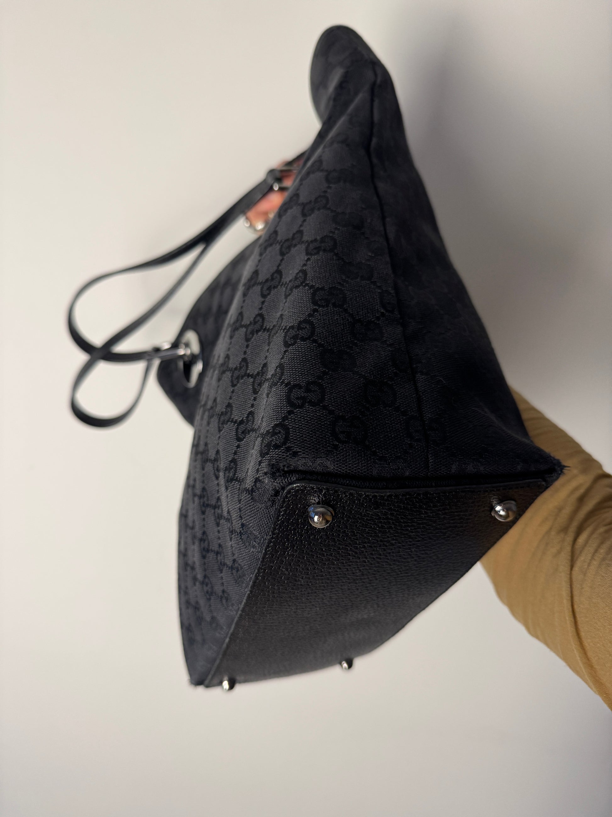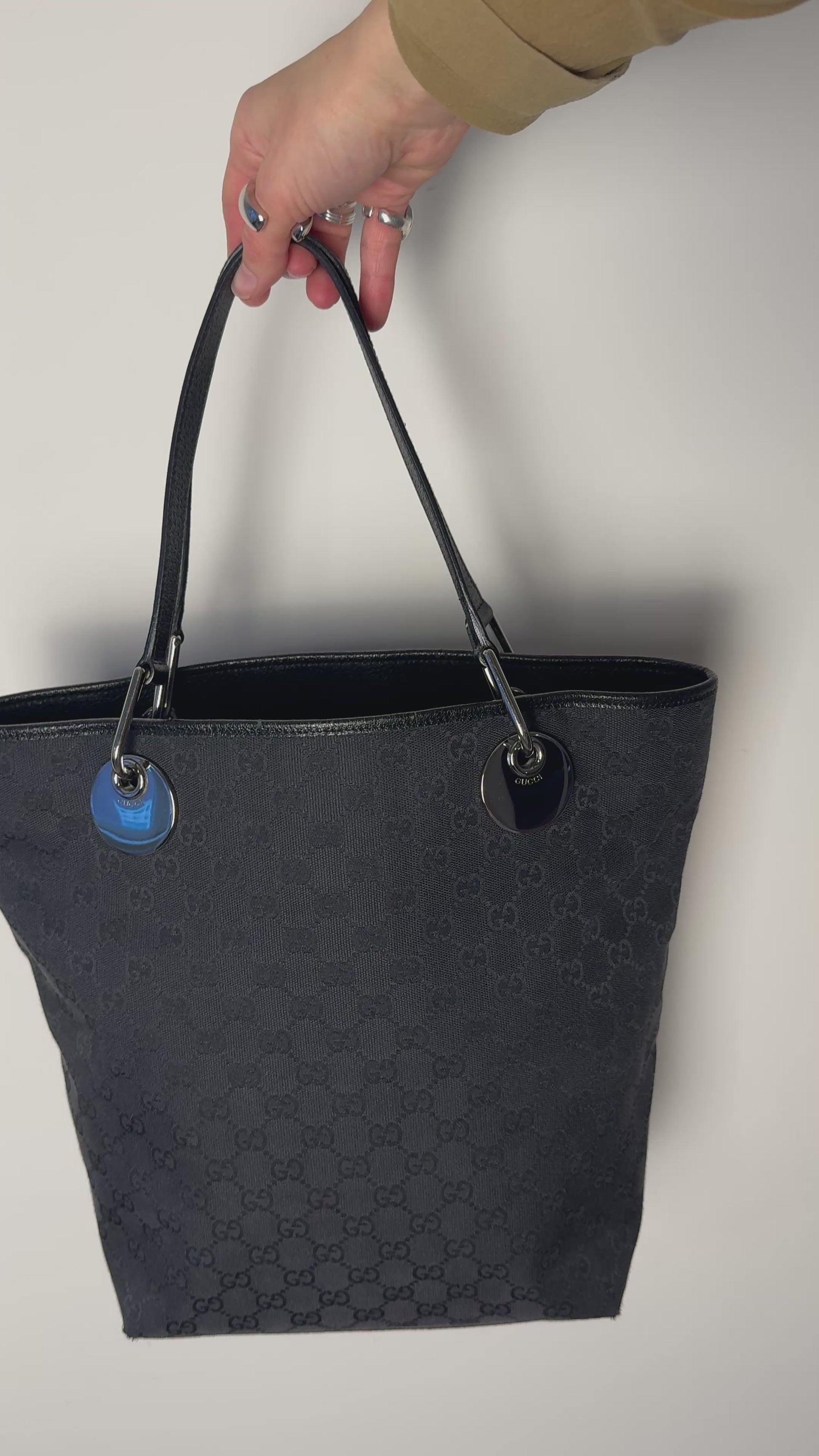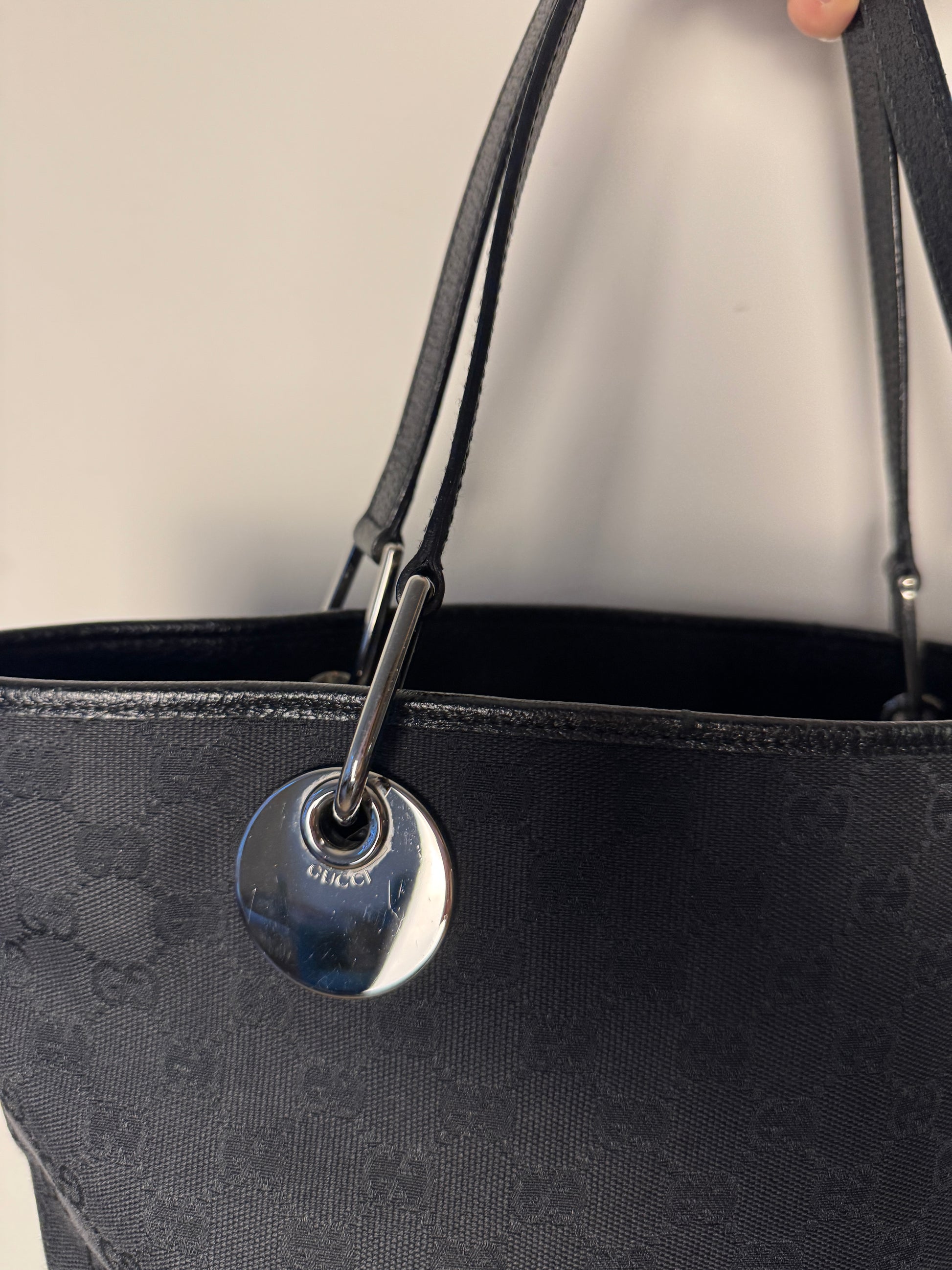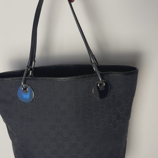 A sleek and structured everyday tote from Gucci’s Eclipse line, crafted in black GG monogram canvas with black leather trim and silver-tone hardware. The polished circular metal handles at the base of each strap are subtly engraved with the Gucci logo. A quiet detail that elevates the entire design.