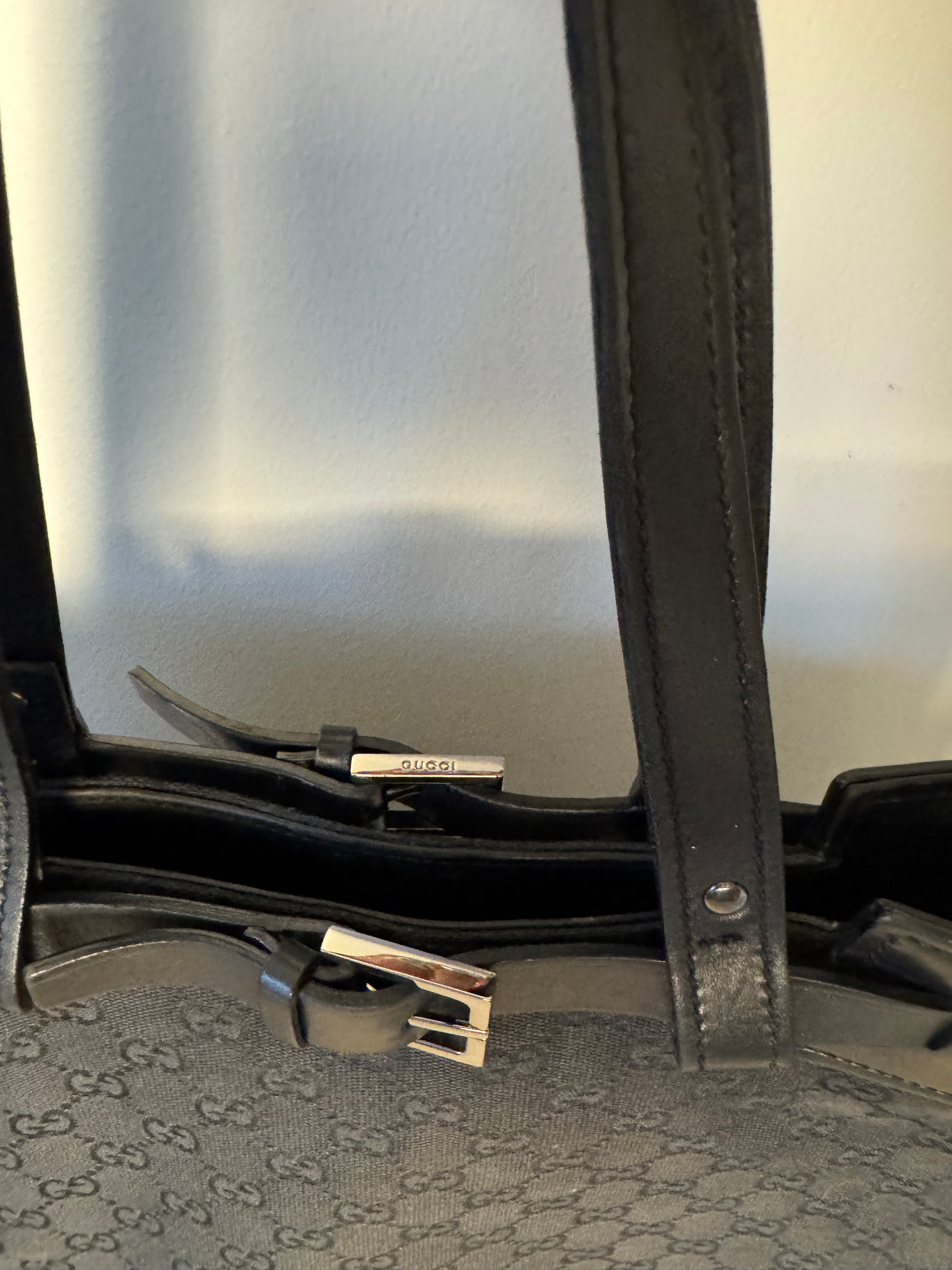 A sleek, structured tote crafted from Gucci’s signature black GG canvas with smooth leather trim and silver-tone hardware. The rectangular silhouette is finished with a refined buckle detail at the top. A subtle nod to Tom Ford’s penchant for sensual, streamlined design during his Gucci era.