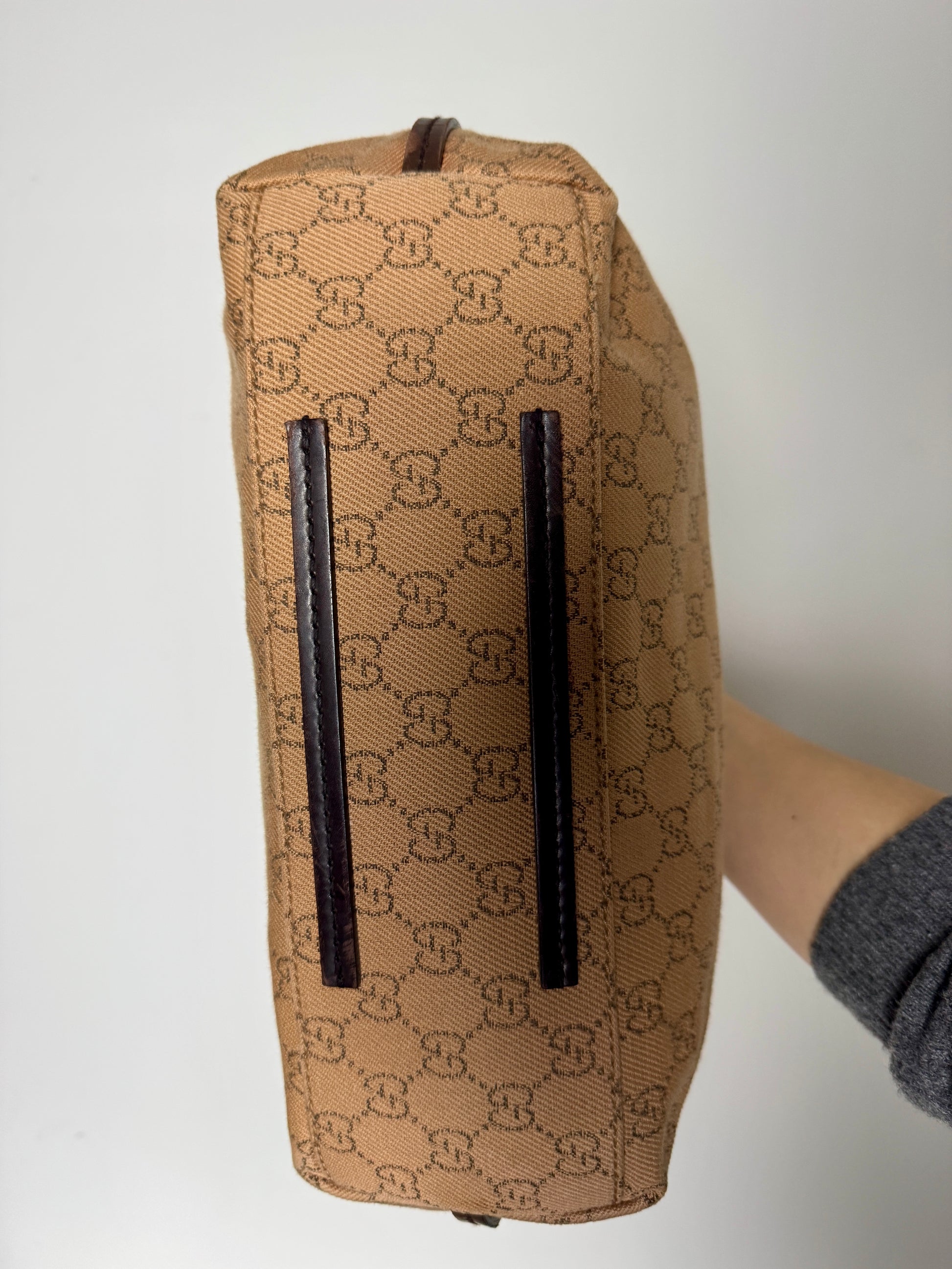 The classic beige GG monogram canvas paired with dark brown leather straps feels very late nineties in the best way. Clean, unfussy, no loud hardware, just strong branding through texture and pattern.