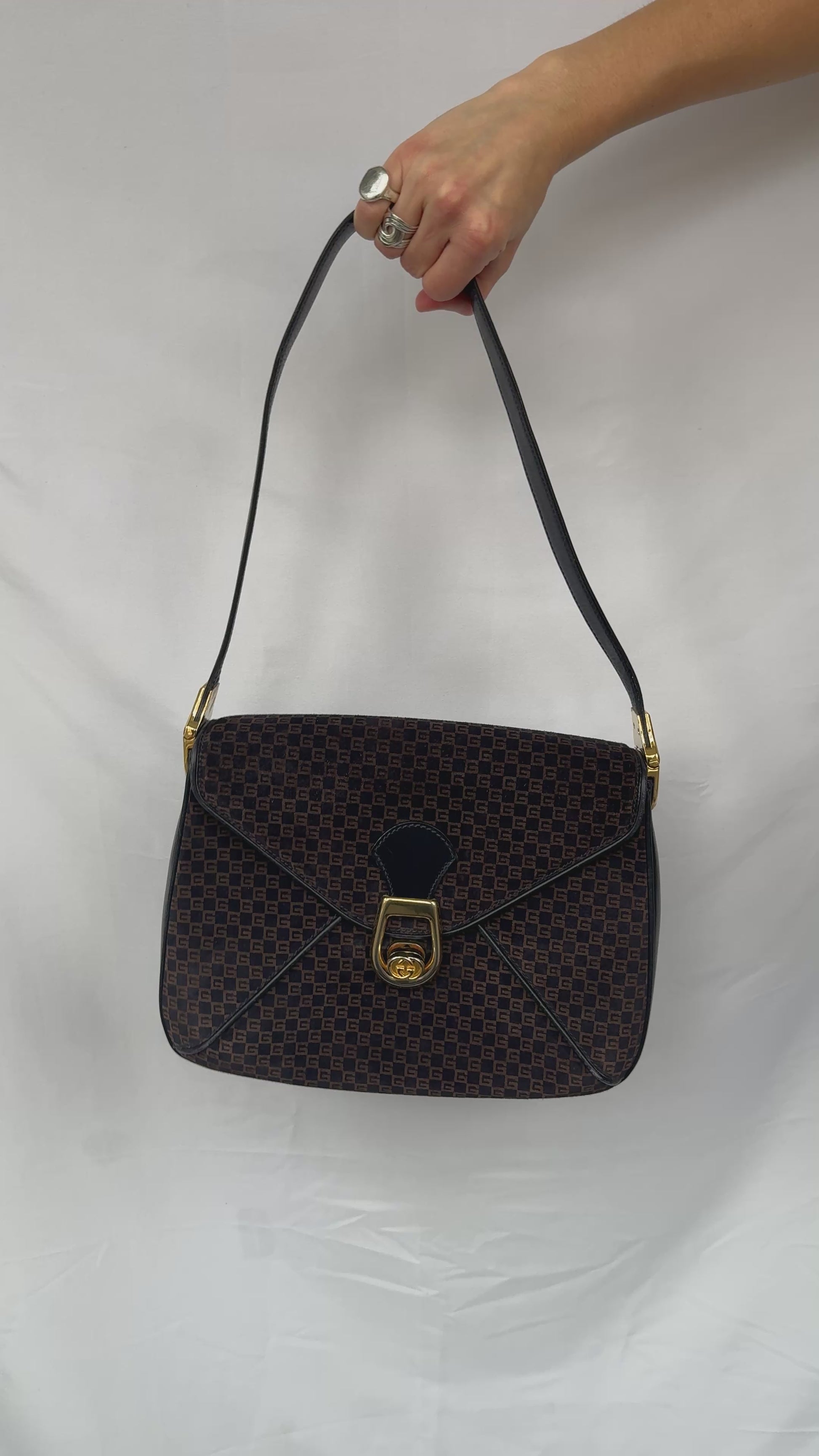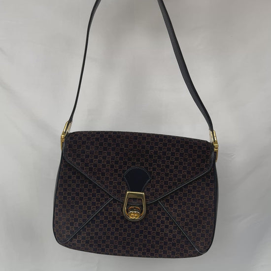 An elegant late-1970s Gucci shoulder bag crafted from the house’s GG monogram suede with dark blue smooth leather trim and strap. The structured flap design closes with a gold-tone clasp. A detail introduced under Aldo Gucci, who redefined the brand’s equestrian heritage into refined city handbags. A rare find in suede rather than the usual coated canvas, giving it a softer texture and elevated tone.