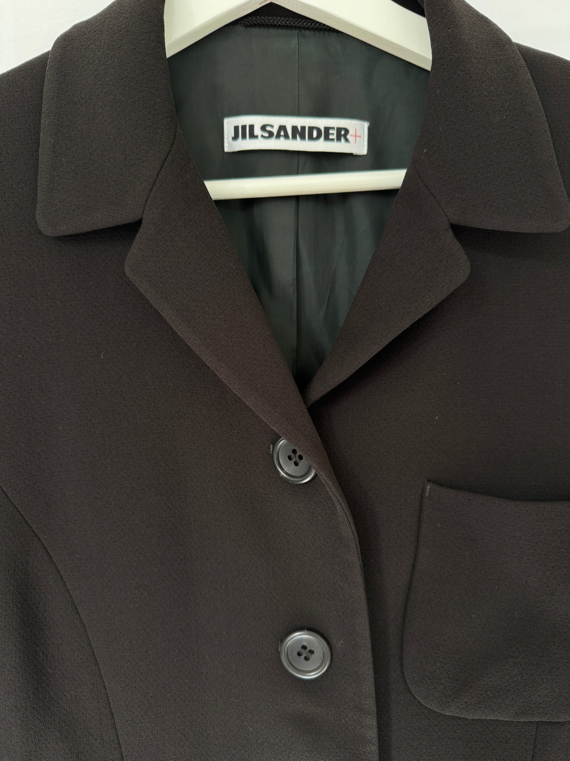 Minimal, softly structured blazer in espresso brown pure new wool with three patch pockets (two hip, one chest) and a four-button single-breasted front. Neat notch collar, lightly shaped waist, and clean lines throughout. Fully lined in cupro. Woven JIL SANDER+ label; Made in Germany.
