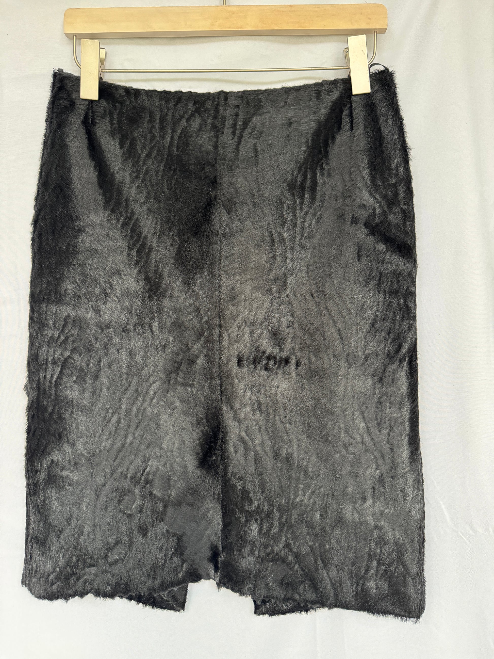 A sleek pencil skirt cut in black pony hair (read: hair-on calf leather—no pony involved) with a plush, velvety nap and clean lines. Fully lined, straight hem, and that minimal Max Mara finish. Sits low on the hips and, on most frames, lands just over the knee—a great length with boots or loafers.