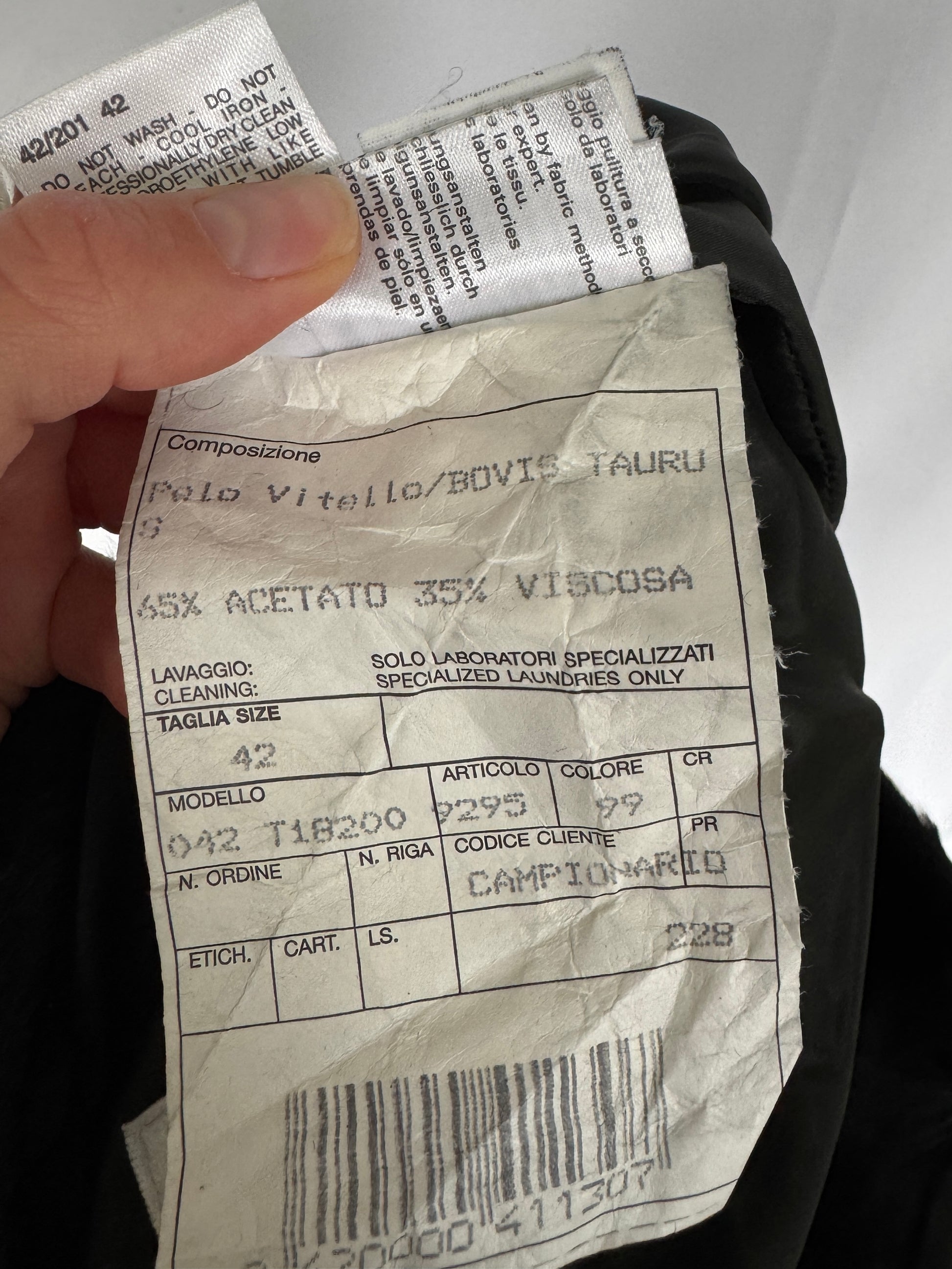 Material: Hair-on calf (“pelo vitello / bovis taurus”) · Lining 65% acetate / 35% viscose (labels)