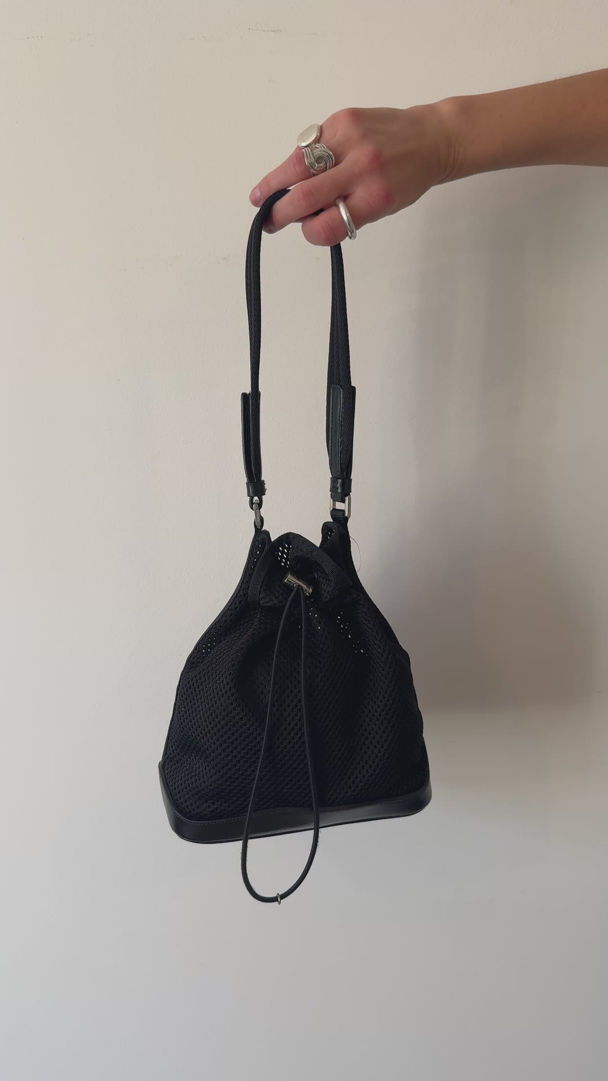 A rare Prada bucket bag that balances sporty ease with refined detailing. Made from black mesh with smooth leather trim at the base and leather-reinforced handles, it features silver-tone hardware engraved with Prada and a drawstring closure with a branded button. Light yet structured, it’s a striking example of Prada’s early-2000s experiments with technical materials.