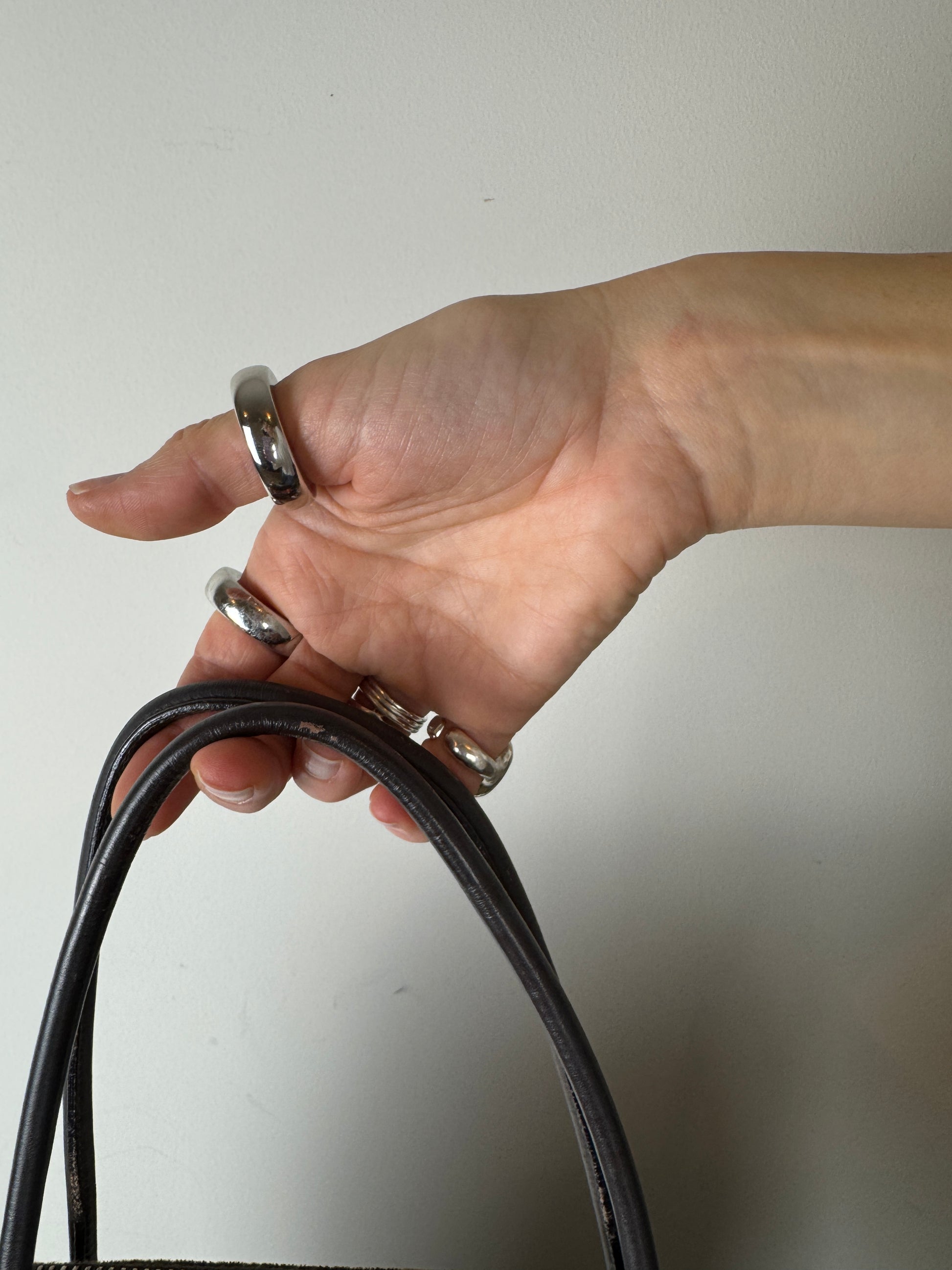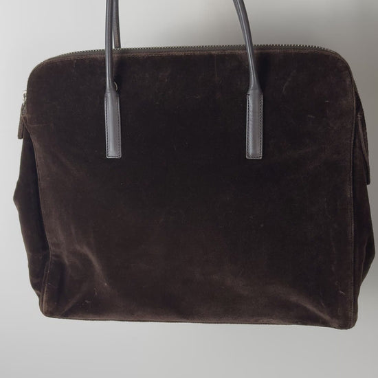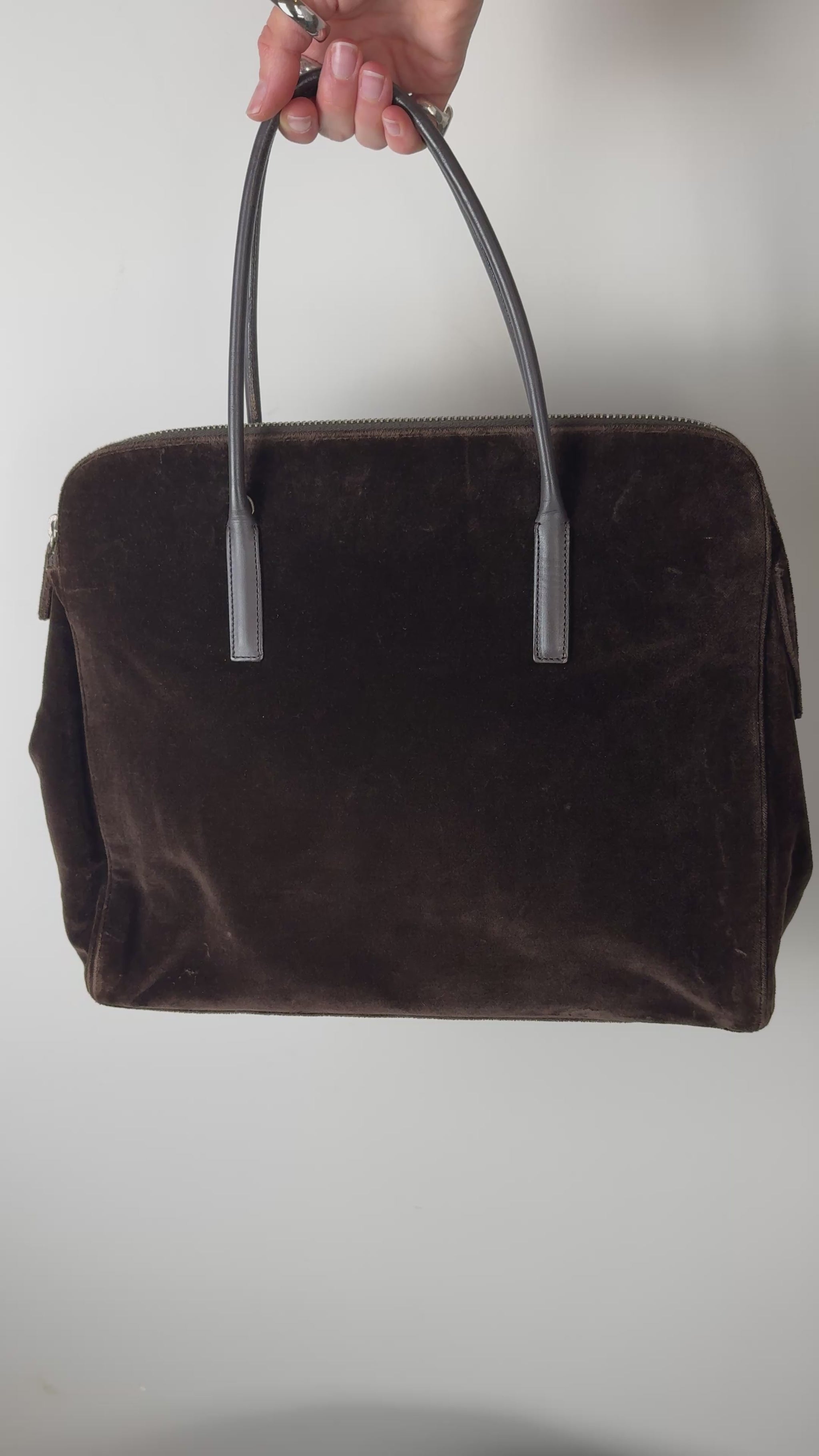 A structured velvet tote in deep chocolate brown, finished with slender rolled leather handles and tonal metal logo at the side. This piece reflects Prada’s late 1990s design language. Quiet, tactile, and functional. The minimalist silhouette keeps it sleek, while the velvet surface adds depth and softness.