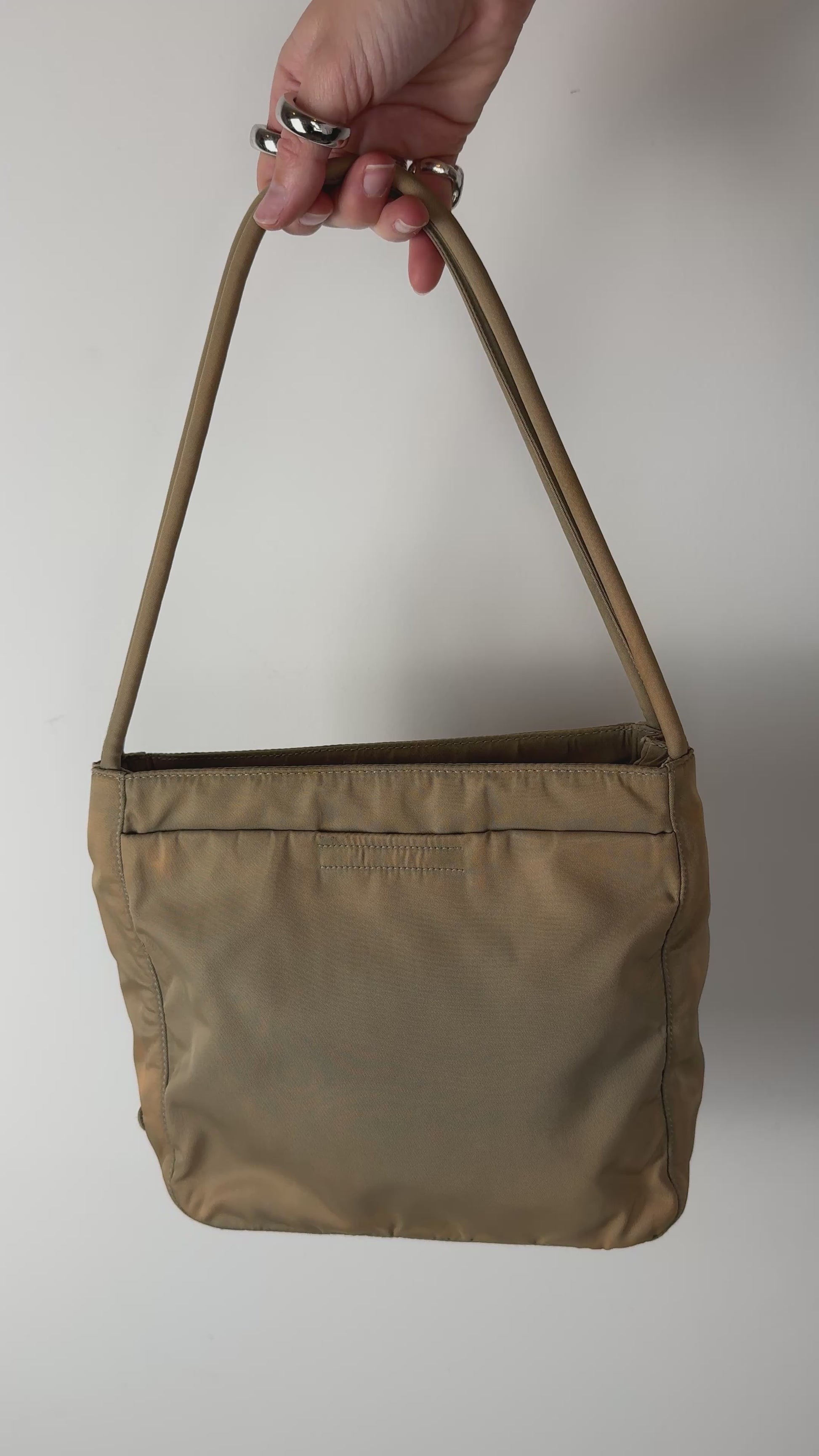 A classic Prada shoulder bag in khaki nylon with matching rolled nylon handles. This style comes from the late 1990s, when Miuccia Prada reimagined functional design through minimalist shapes and utilitarian materials. The slim rectangular silhouette and lightweight structure make it easy to wear, while the tonal design keeps it effortlessly modern.