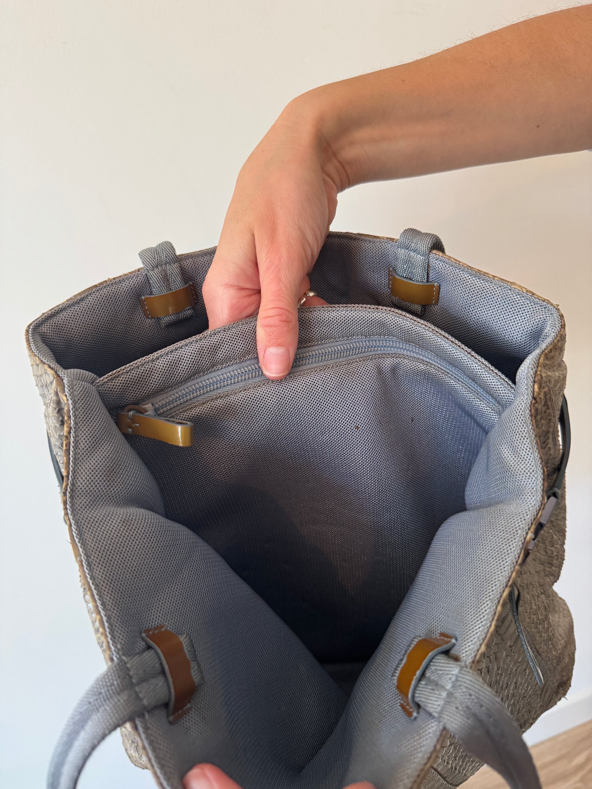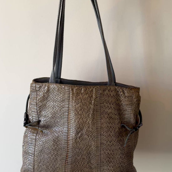 Material: Genuine python with woven leather panels; grey canvas handles; mesh lined interior